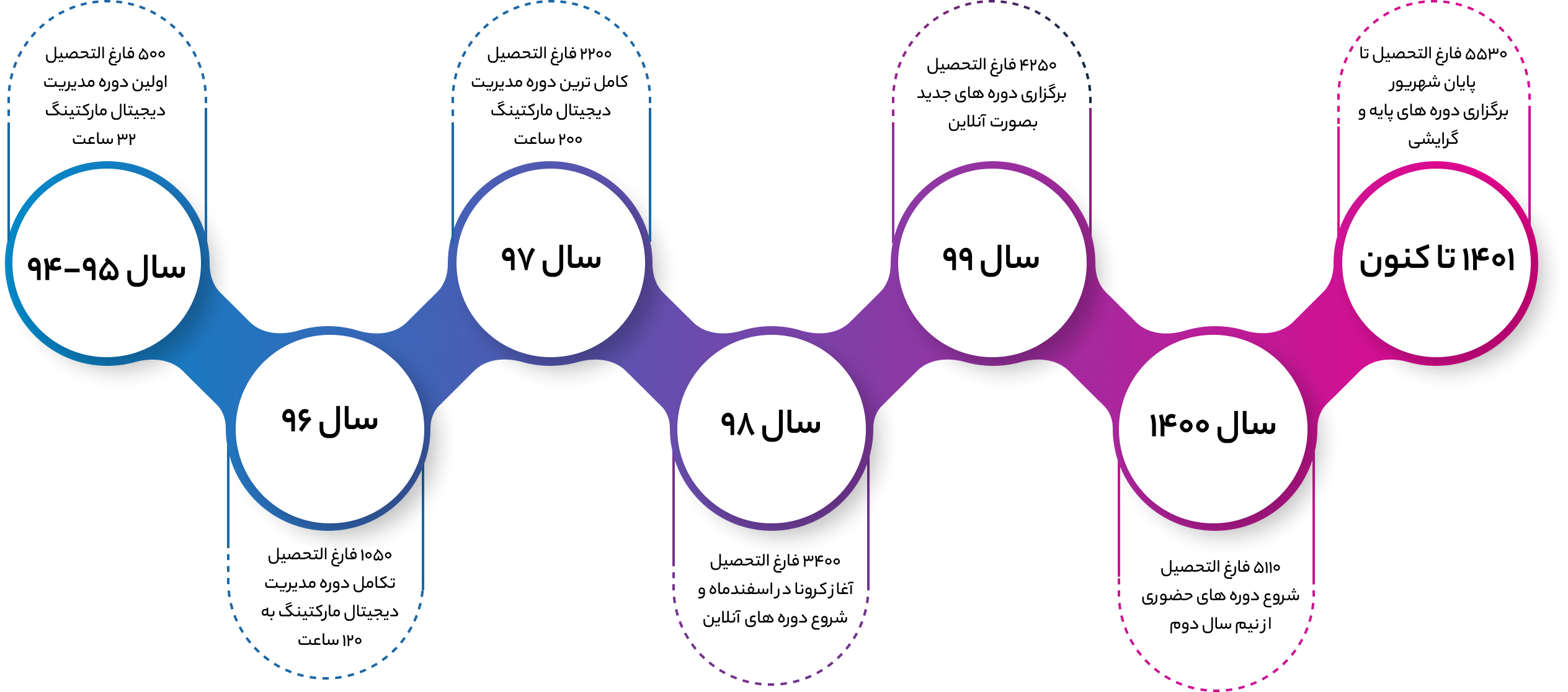 از سال ۹۴ تاکنون آکادمی بیش از ۱۸۸ دورهی تخصصی دیجیتال مارکتینگ برگزار و هزاران ساعت محتوای آموزشی دستاول تولید کرده است و باعث افتخار ماست که بیش از ۷۸۰۰ نفر از فعالان، صاحبان کسبوکار و مدرسان حوزهی دیجیتال مارکتینگ کشور از دانشآموختگان آکادمی بودهاند. اما داستان ما ادامه دارد… در آکادمی همیشه بهروز بودن و ارائه آموزش تخصصی باکیفیت و کاربردی و همراهی و حمایت نامحدود از دانشآموختگان و دانشجویان اولویت ما بوده و خواهد بود. در حال حاضر بخش آموزش دورههای تخصصی و بخش اجرای پروژه های دیجیتال مارکتینگ با اجرای پروژههایی مثل طراحی سایت، سئو، تولید محتوا، ادمینی شبکههای اجتماعی ، مشاوره کسب و کارهای دیجیتال، طراحی کمپینهای تبلیغاتی دیجیتال و گوگل ادز در کنار شماست. تیم حرفهای و متخصص مجموعه اکنون در ساختمان مستقل مجموعه در خیابان بهشتی میکوشد همواره بهترین و تخصصیترین خدمات را به فعالان و علاقهمندان این حوزه ارائه دهد. ما همواره معتقدیم که تنها اولین بودن نمیتواند تمایز باشد، بنابراین تلاش کردیم که اولین و بهترین باشیم.